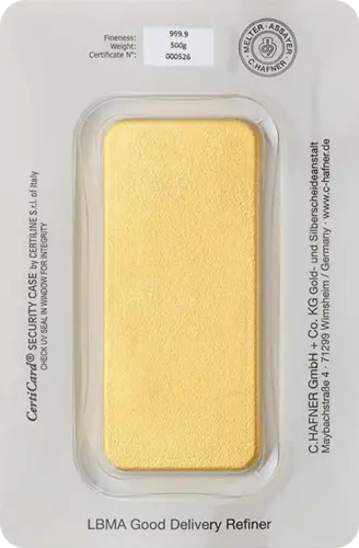Schreibe die erste Rezension für „500 G Feingold Goldbarren C.Hafner“