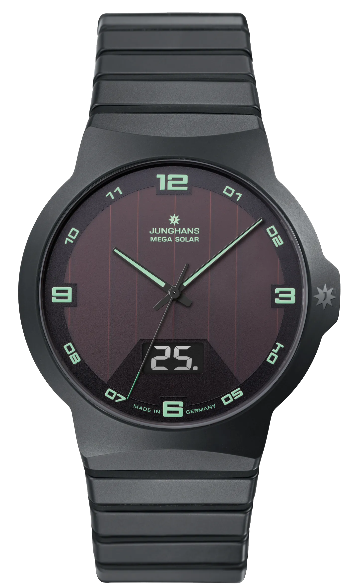 Junghans ist Pionier der Funkuhrentechnik und auch in Sachen Sonnenenergie für Uhren ganz vorne dabei. Diese beiden Technologien werden im Modell Force Mega Solar vereinigt. Das Connected Funk-Solarwerk Kaliber J615.84 bezieht seine Energie aus einem Speicher, der über Solarmodule im Zifferblatt kontinuierlich aufgeladen wird. Das Ganze steckt in einem Keramikgehäuse, das gleichermaßen leicht und kratzfest ist. Diese Uhr kombiniert hohen Tragekomfort und Coolness mit enormer Alltagstauglichkeit.