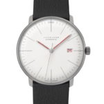Minimalistisches Design mit roten Akzenten: Die Bauhaus-Modelle der Linie max bill greifen die roten Türen des Bauhaus-Gebäudes auf – ein Detail, das Max Bill bei seinem ersten Besuch in Dessau sofort ins Auge fiel. Durch die Fenster eines Bauhaus-Abbilds auf dem Gehäuseboden kann man sehen, wie das mechanische Werk im Inneren arbeitet.